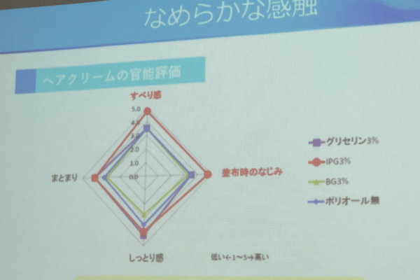 この結果からわかることは、ヘアクリームに配合することで毛髪にしっとり感が与えることでき、髪になじむことで指通りがよくなるといった効果が得られることがわかります。