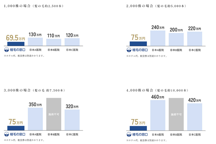 日本では数百万かかる植毛ですが、トルコでの治療費は日本の1/3以下という安さにあります。たとえば、1,000株(髪の毛約2,500本)の場合は約60万円、2,000株(髪の毛約5,000本)の場合は約165万円を節約できるわけです。